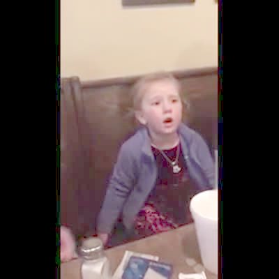 A woman in a restaurant pretends to pull money and a credit card from behind a young girl's ear and the girl looks surprised and says she doesn't know where it came from.