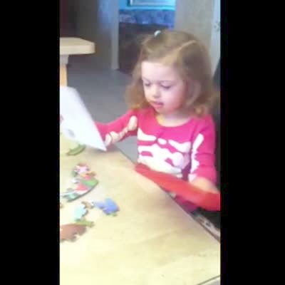 A young girl holds up a flash card that has a bottle of wine on it and she says "that momma juice" while her off-camera mother laughs.
