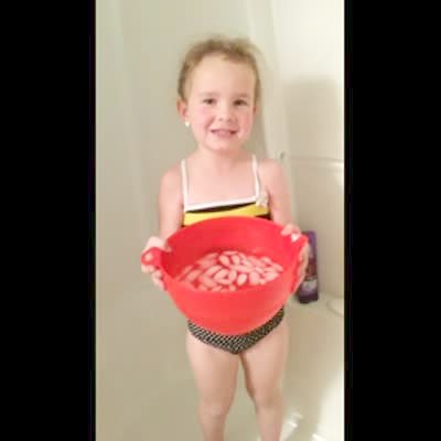 "Ice Bucket Breakdown" - A girl stands in a shower indoors for the Ice bucket challenge and nominates friends to take it before her sister tells her to dump her bowl of ice over herself and the girl suddenly pouts and cries that she changed her mind. Her sister urges her until the girl dumps the water on herself and cries louder.