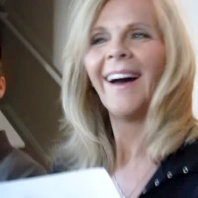 A mom reads her birthday card out loud in a dining room and opens the card to find a stack of money and gets excited but falls out of her chair.