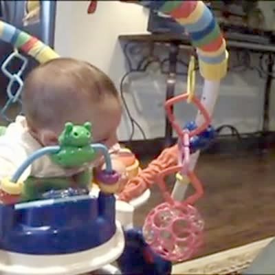 Baby girl sitting in a walker laughs at operatic musical greeting card. Cute.