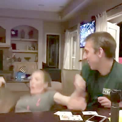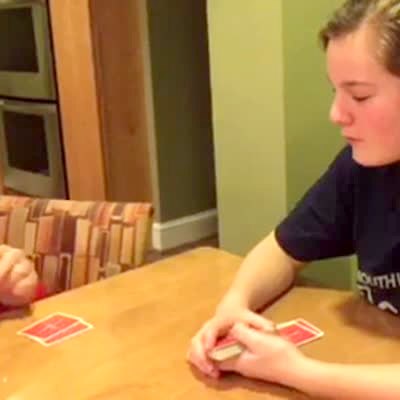 A young girl plays cards with people around a table. The young girl says, "Get off your frickin' phone and play the game." Then she hits her hand on the table.