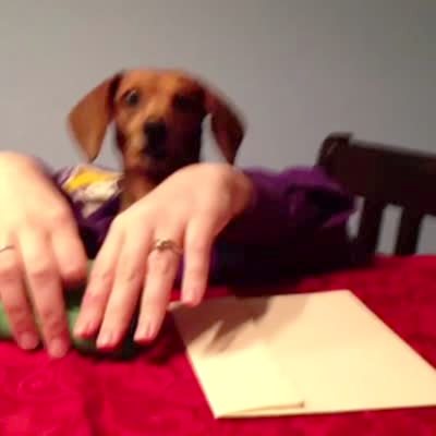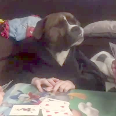 A person acts as a dog's arms and makes it look like he's playing Uno seated at the dinning room table. When he loses he throws his cards down.