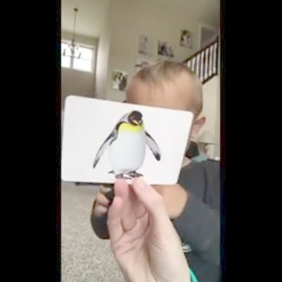 A woman shows a boy tot animal cards in the living room and the boy says the penguin card is his father.