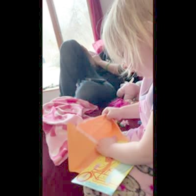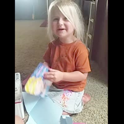 A little girl is opening a greeting card. At 0:23, she says "no money?" Asks mom to put money in her card. birthday
