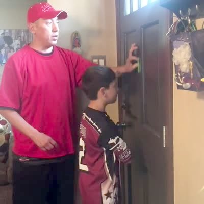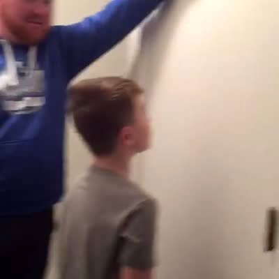 A man does the credit card challenge with a boy in the living room. When he drops the card that he holds against the door, the boy goes to stop it with his head and headbutts the door and falls down.