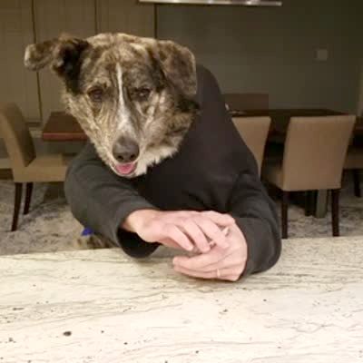 A dog with human hands plays cards with a teen girl in the kitchen. AA: dogs with human hands