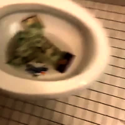 A tot girl puts her dad's cash and credit cards into the toilet in a bathroom and he catches her and says she is in trouble.