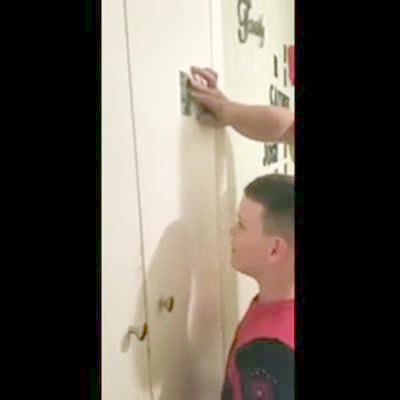 A woman tricks a young boy with the credit card against the wall trick and he smashes his face against the door.