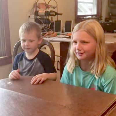 A young girl does a magic trick in a living room in which she holds up cards and her father guesses them. He always guesses correctly, because her younger boy brother holds up his hands to share the number behind her back. The young girl yells "how do you do that?"