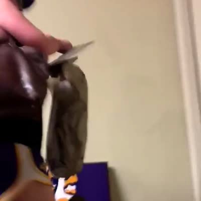A man in his living room opens a card and a bunch of paper scraps fly out. The man yells and the scraps get in his mouth. He spits them out.