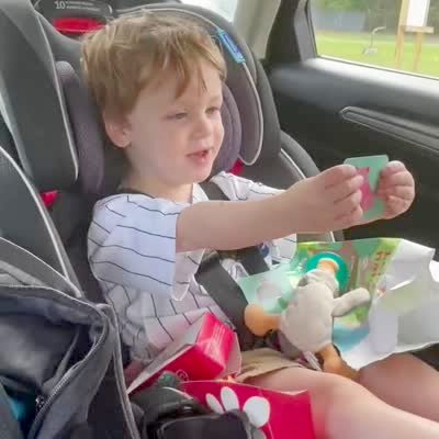 A family is in a car at a drive-through safari. A tot boy in the backseat holds up animal flash cards and says the names of each animal. Meanwhile, a man and woman tell him to look at a giraffe standing right outside the window. The boy ignores them and only cares about his flash cards.
