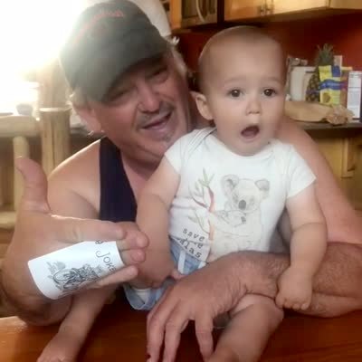 A senior man does a card trick for a baby boy at the kitchen table. When the man flips the card behind his fingers, the boy drops his jaw.