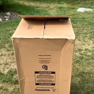 A young girl tells her dog to get in a cardboard box and the dog jumps in.