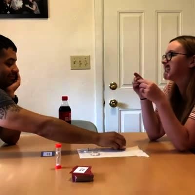 A woman tells a man she's pregnant as they play Speak Out at the kitchen table. She reads cards that say "There's a baby in my belly" and "You're going to be a dad" as the man continues to play the game unaffected. She asks "How far long do you think I am" and the man then asks "are you pregnant" repeatedly, then hugs her and says "I'm gonna be a dad".