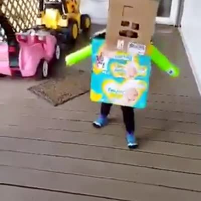 A tot boy in a diaper box costume runs after his dad on a deck but he trips and falls.