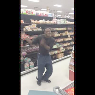 A young man dances the Carlton in a grocery store indoors.