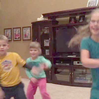 Two girls and a boy dance the Carlton dance indoors.