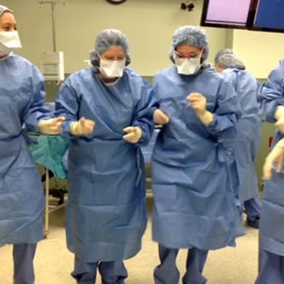 Four women in scrubs do the Carlton dance in a hospital.