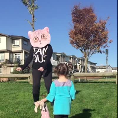 A person in a cat mask does the Carlton dance outdoors.