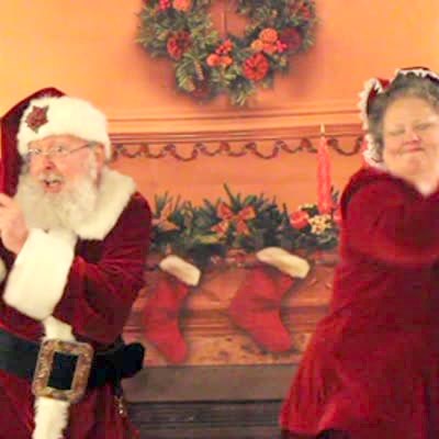 Santa Claus and Mrs. Claus kiss and dance the Carlton dance in front of Christmas trees indoors. AA: Carlton Dance.