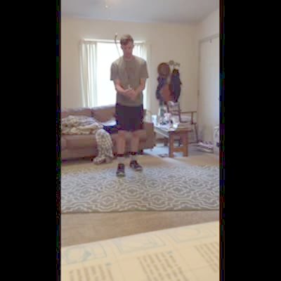 A teen boy, young boy and woman dance to music and the teen boy hits his head on a chandelier in a house.