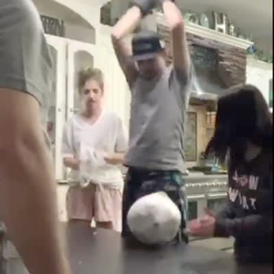 A family of men and women wear oven mitts and try to unwrap plastic wrap from a ball on a dinner table. One man hits and breaks a chandelier. The glass falls from the ceiling and the family stands shocked.