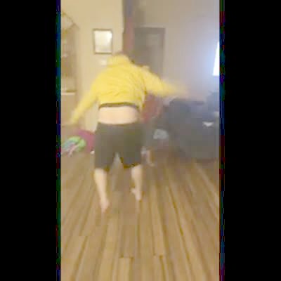 A man breaks a chandelier in the living room when he kicks it with his foot as he does cartwheels.