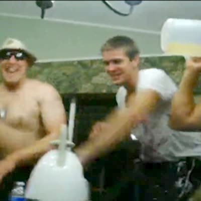 Man spins a chandelier hanging over the dining room table at a party. The chandelier light comes crashing down.