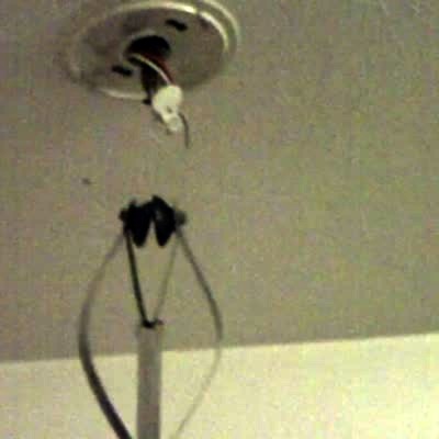 Mouse is hanging from a light fixture wire in a hole in the ceiling, the mouse jumps down and scares a woman as she tries to catch it with prongs. Camera loses focus. no tail.