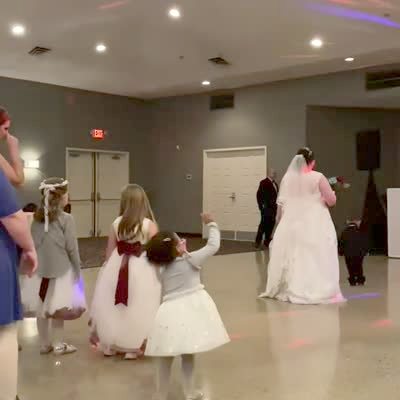 A bride at a wedding reception throws a bouquet and it lands on top of a chandelier on the ceiling.