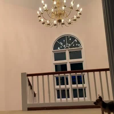 2 teen girls dance in the dining room, 1 girl throws her hands up and knocks over the chandelier, turning off the lights.