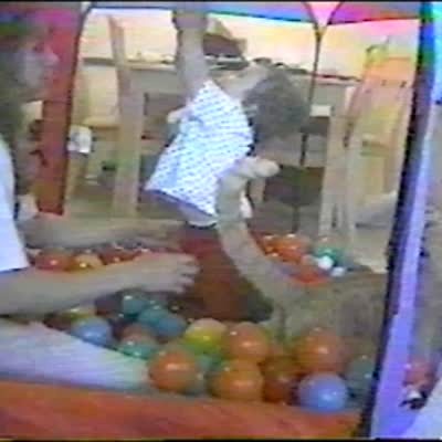 Woman in ball pit with tot girl and cat, who runs and knocks everything around. Total chaos