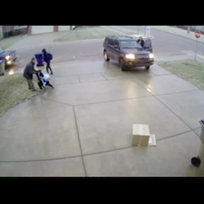 A car struggles to drive on an icy driveway. A young girl taking out the trash slips and the trashcan slides down the driveway. Another young boy walks out and slips on the driveway. Chaos ensues.
