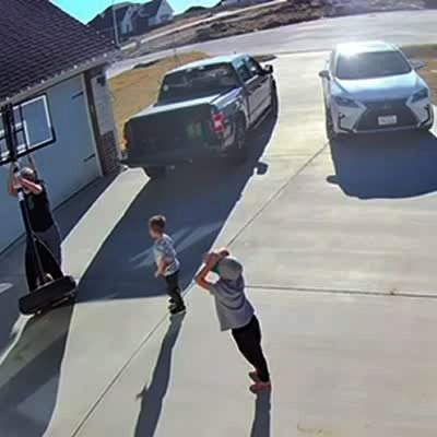 A young boy dribbles a basketball while his mother rides a scooter on a driveway. There is a crash of thunder, and the tot boy screams and runs to the house. The woman drops her scooter, and the boy's father falls down. Security footage.