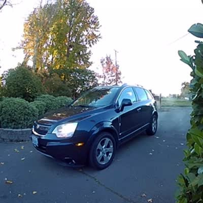 A woman hops out of her vehicle to put her dog back after he runs out of his gate. The car starts to roll backwards as chaos ensues and the car crashes into the house offscreen. Security footage.