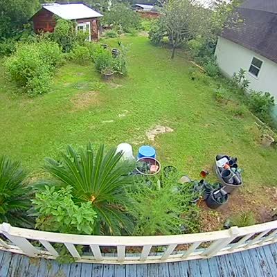 Thunder strikes in the yard and a group of chicken birds all jump simultaneously then run away. Security footage.