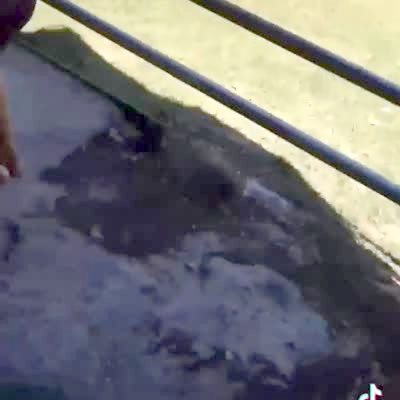 After a teen girl puts a baby chicken back into its cage on a farm, a duck comes after her. She shrieks then trips over a dirty kiddie pool, falls on her back and loses her shoe in the process.