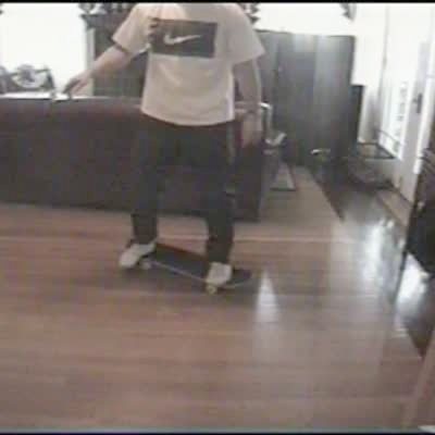 Dad tries to ride a skateboard in the house & crashes into the china cabinet & falls down. Shelf is about to fall on him but he stops it with his feet, glass still breaks. Man is ok - has short recovery, short tail. Bonehead.