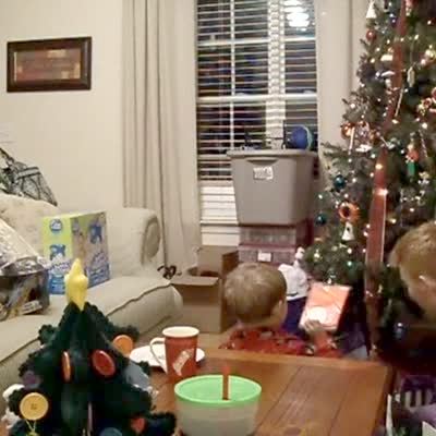 Boy opens Christmas present and it's a baseball set. Boy reads the label and says "China made it and sent it to Santa." Kids say.