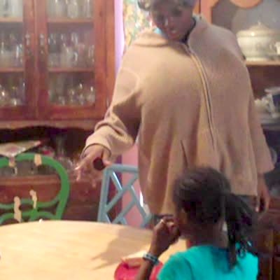 A woman puts her tongue on a bug-zapper racket for a "half a tank of gas." It shocks her and she jumps back. Her family laughs in the kitchen.