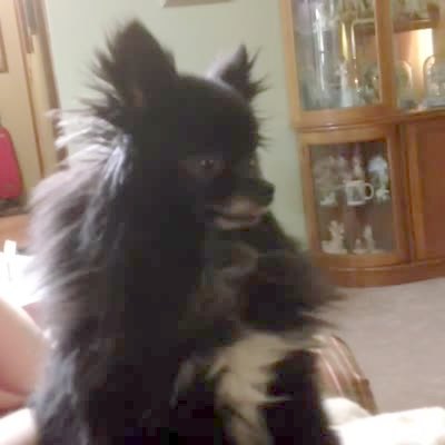 A dog sits on a woman's lap in a room in a house. A man offscreen asks the dog if he wants a treat. Every time anyone says "treat", the dog's ears perk up.