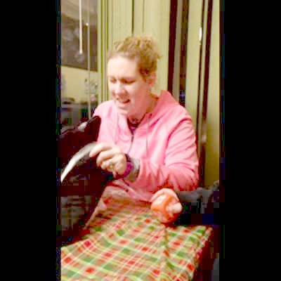 A woman asks her dogs which one of them had unwrapped the Christmas gifts in the house. The two dogs look at her as one dog has gift wrap in its mouth.