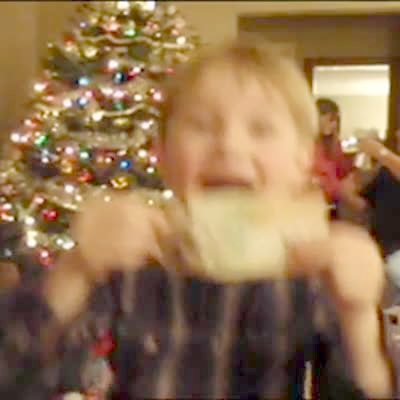 Young boy dances excitedly with a dollar bill he received for Christmas. Suddenly the money rips and he instantly looks devastated. Sad face.
