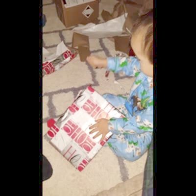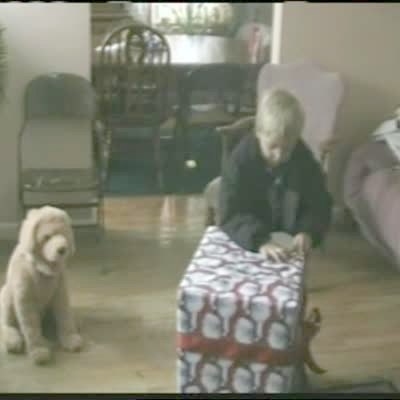 "Oblivious Boy" Boy opens Christmas gift by lifting the box up to find a toy dog underneath. Boy doesn't get it & keeps shaking the box, then takes off wrapping paper. When he finally sees the dog he thinks it's magic.
