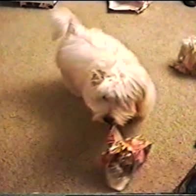 A small dog unwraps a Christmas present, which is a ball. The ball rolls away, but the dog doesn't notice and he looks around for his gift.