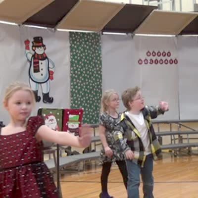 A boy walking in a line at a Christmas concert waves to his mother and then announces that he has to go potty.