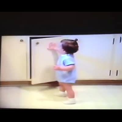 A young girl sits on a hover board and spins in circles. Then she rides backwards and crashes into a bookshelf, and a stack of DVDs fall on her head.