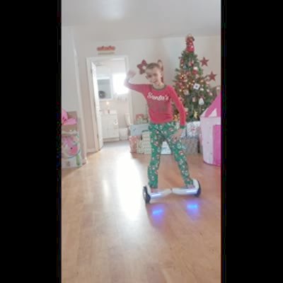 A young boy falls off of a hoverboard in the living room when he rides backwards in to a television stand while he dabs.