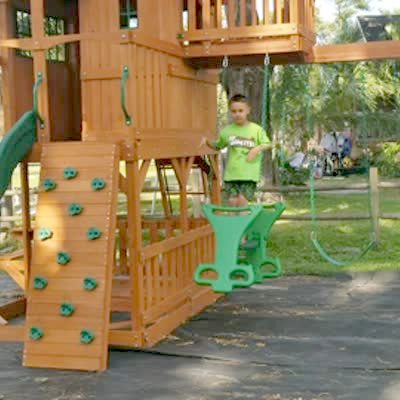 A young boy falls off of the two person swing on the playground in his backyard after he stands up and dabs.